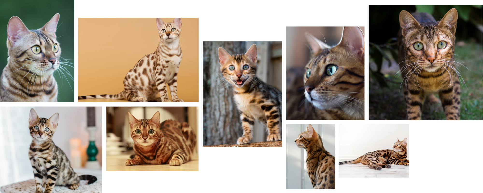 L’une des caractéristiques les plus populaires du Bengal est sans conteste sa robe fauve claire qui contraste avec des motifs tachetés, marbrés, ou rosettes (empreintes de pattes, pointes de flèches ou anneaux), selon les standards officiels établis. Son poil court et épais met d’ailleurs parfaitement en valeur les nuances de son pelage unique. Ses grands yeux peuvent être verts, bleus ou bleus clairs, et lui confèrent un air vif et intelligent. Enfin, ses oreilles sont dressées et pointues, sans plumets.